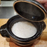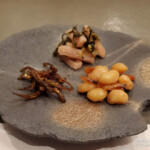 土鍋ごはんとともに小鉢として、滋賀県の伝統野菜で鮮やかな桜色のガブの漬物「日野菜のお漬物」や、琵琶湖の魚を使った佃煮「湖魚の佃煮」、大豆と琵琶湖のスジエビを煮た郷土料理「えびまめ」が提供されます。刻み山葵、粗塩の薬味で味の変化も楽しめます。