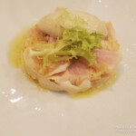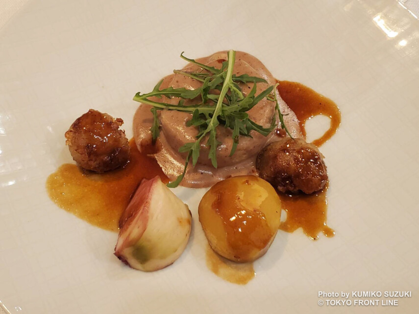 前菜「白レバーのフォンダン リードヴォーと栗」 は、白レバーをなめらかなフォンダン仕立てに。ムニエルにした高級食材の牛の希少部位リードヴォーと、栗や無花果とマデラソースを合わせ、セルバチコをのせた一皿。濃厚な味わいを、食感や香りのコントラストとともに堪能できます。