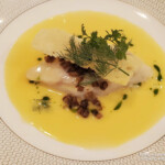 魚料理「浜田港から届いた平目 ノワイリーソース ディルの香り」は、島根県・浜田港から直送された新鮮な平目を使用した一皿。上品な甘みをもつ平目に、ノワイリーソースを合わせ、爽やかなディルの香りを添えて仕上げています。魚介の旨みとハーブの清涼感が調和する味わいが特長です。