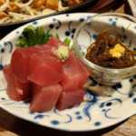 メニューには、三崎直送のまぐろをはじめ、未利用魚を使った料理が並びます。まず最初に提供されるのは、「三崎直送!まぐろのぶつ盛りのお通し」(550円)。「フィッシュ&チップス」(1,078円)は、ほっけを使用したサクサクの衣とふんわりした白身が特徴。「厚切り銀たら焼き」(1,650円)は、箸でほぐれるほど柔らかく、外は香ばしく、中はふっくらとした食感です。そのまま食べても美味しいですが、大根おろしや酢味噌、山椒で味変を楽しめます。