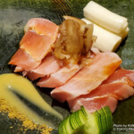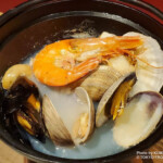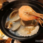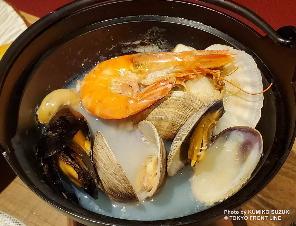 卓上で仕上げる「魚貝の吟醸酒蒸し(1,089円)は、海老、帆立、蛤、牡蠣、ムール貝などを日本酒で蒸しあげた酒蒸し料理。日本酒が貝の旨味をさらに引き出し、深い味わいに仕上がります。お好みで柚子胡椒を添えていただきます。