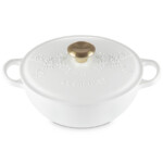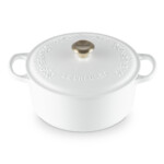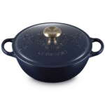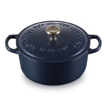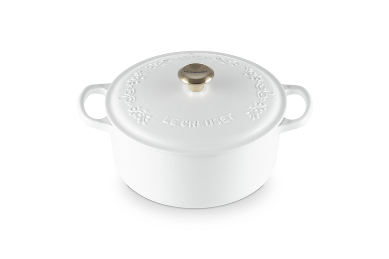 鋳物ホーローウェアから、レースのような繊細なレリーフを施し、さりげなく輝くツマミを合わせたデザインの「シグニチャー ココット・ロンド 22cm」と「シグニチャー マルミット 24cm」が登場。