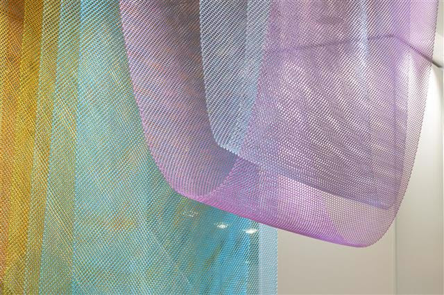 今回、日本で初めて空間演出を手掛けた、香港を拠点に国際的に活躍する建築設計事務所COLLECTIVEは、日本古来の建具として重要な要素である「障子」に着目。1階エスカレーターホールに再利用できるアルミの構造体を組み合わせ壁面を作り、その上に不織布で覆い尽くすことで、三次元的にモダナイズされた「障子」を出現させました。