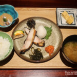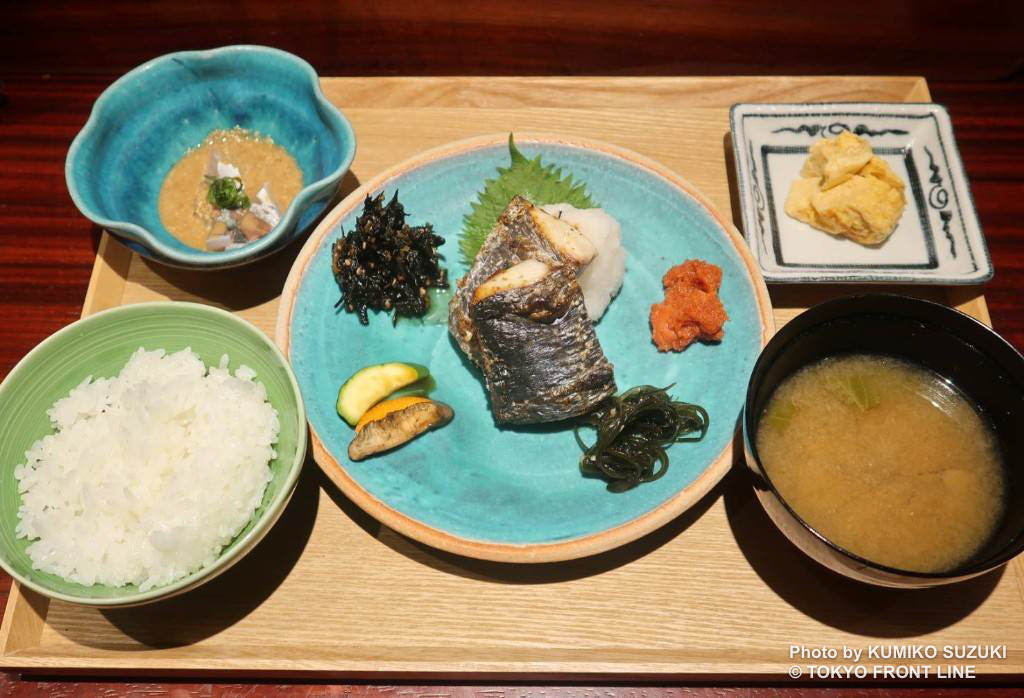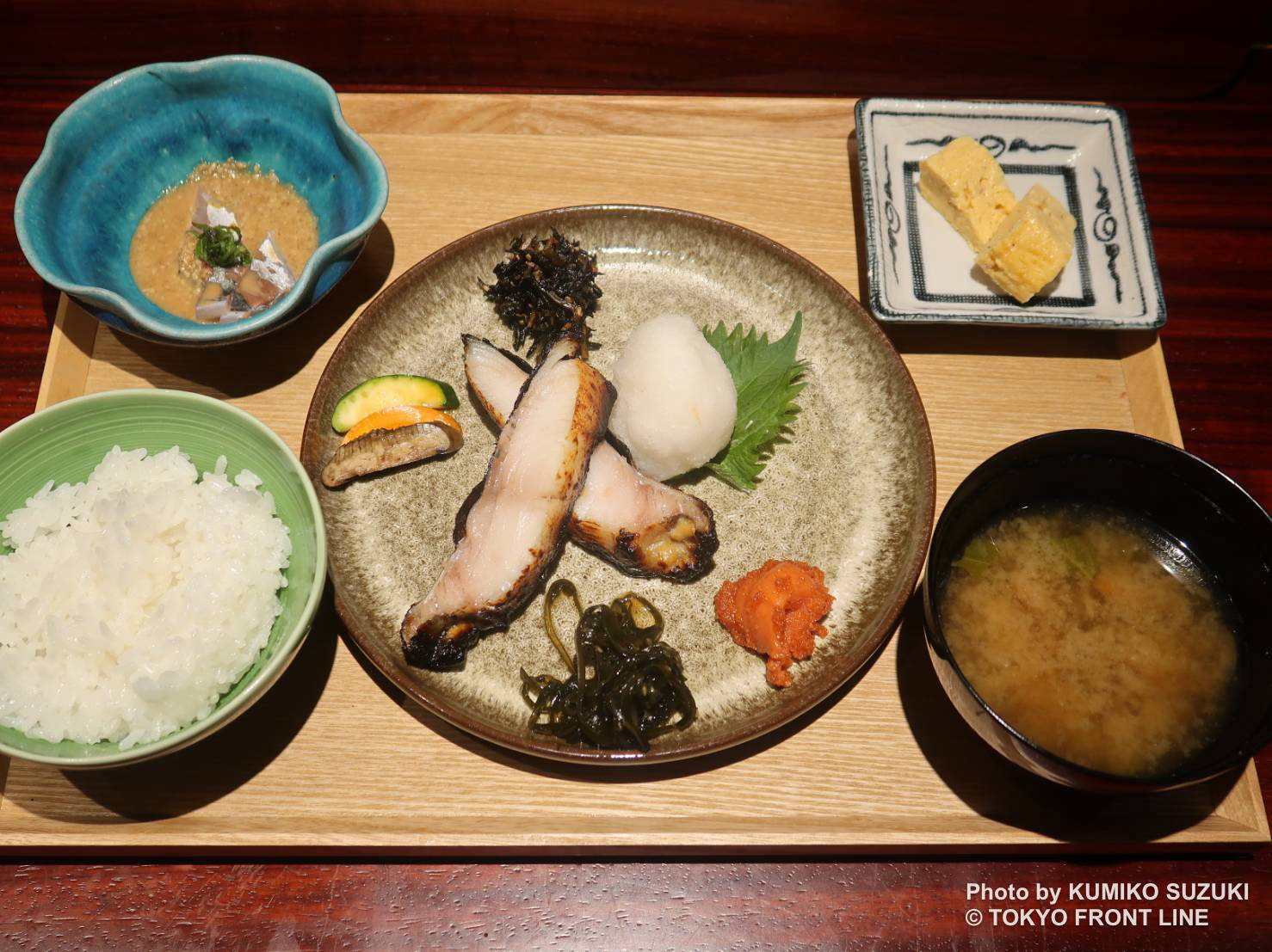 注文をいただいてから丁寧に仕上げる焼き魚は、毎日約10種類ほどをご用意。2日間漬け込む「銀ダラ西京焼き」や、「銀鮭焼き」、「ムツ柚庵焼き」など、メニューは季節や仕入れにより変化します。ランチタイムの定食には、小鉢2種、羽釜ご飯、味噌汁、お茶漬け出汁がつき、ご飯と味噌汁はおかわりが可能です。