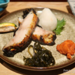 銀だらの西京焼き定食(2,300円) は、脂がのった銀だらと甘味噌のコクが調和した濃厚な味わい。炭火によって余分な水分が抜け、味噌の香りがふわりと立ち上がります。夜は、焼き魚に羽釜ご飯、漬物、味噌汁(1,100円)のセットをプラスして定食としても楽しめます。