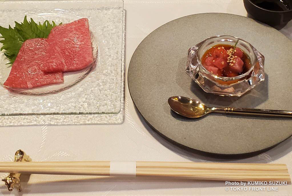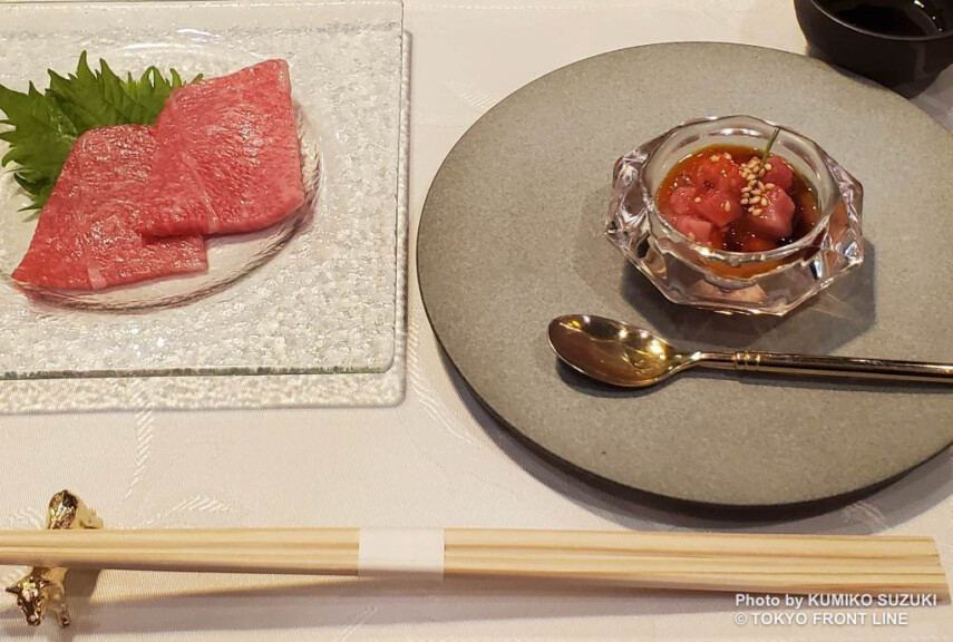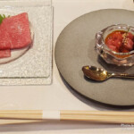 コースは、舌の上でほどけるような「とろけるお肉」からスタート。凝縮された肉の旨味が、これなら続く肉料理への期待を高めてくれます。「お肉刺し」は、しっとりとした食感と上質な旨みが際立ちます。