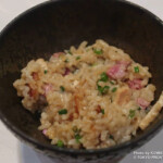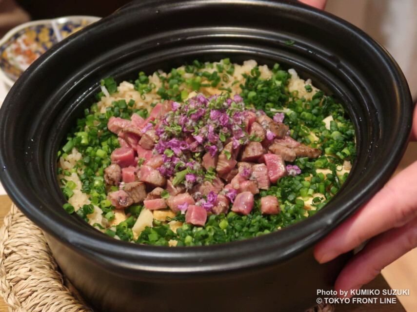 名物の「お肉の土鍋ごはん」は、和牛の出汁を数時間かけて丁寧に引き出した、滋味深い一品。土鍋でふっくら炊き上げたごはんに和牛の旨みが行き渡り、一粒一粒から肉と米の美味しさが重なって広がります。香り高い和牛の余韻が、コース全体の満足度をさらに高めています。