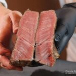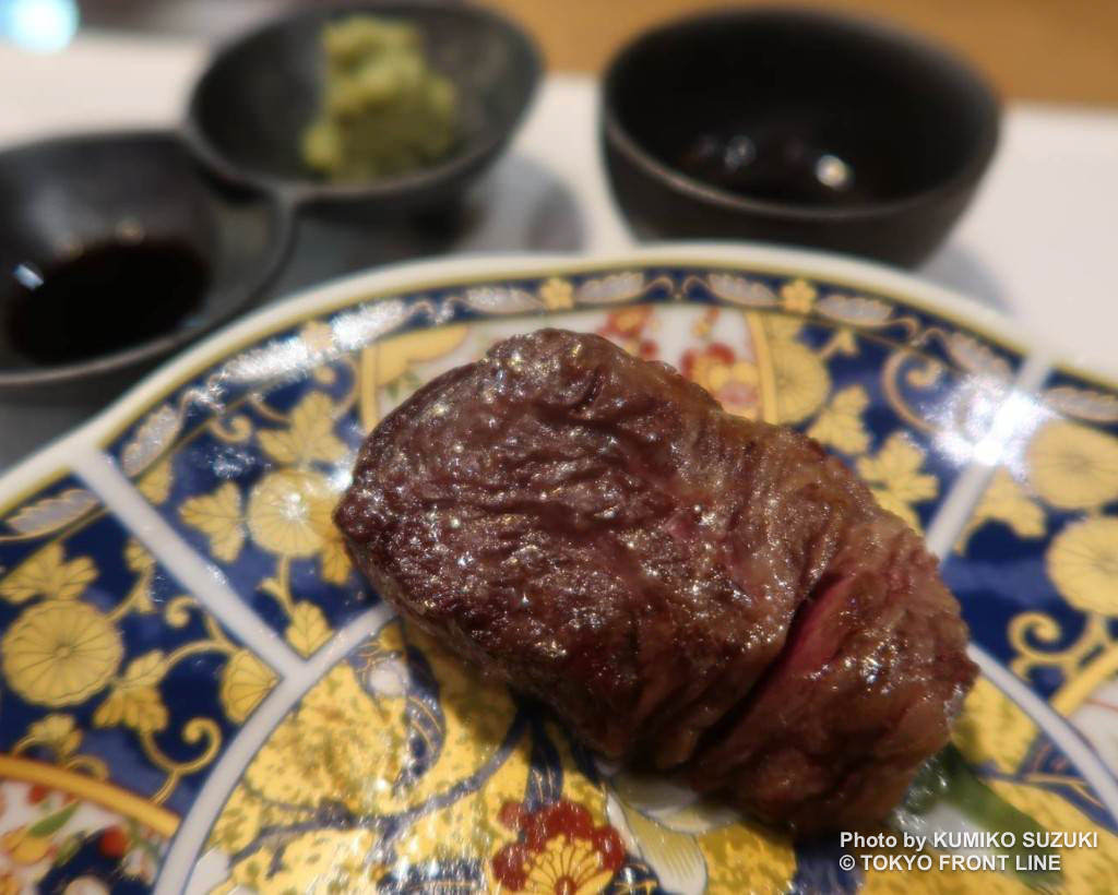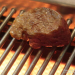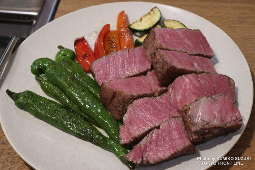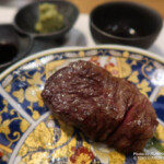 追加料金で注文できる特別メニュー「シャトーブリアン」もおすすめ。伺った日は、シェフによるミートカットや、炎のパフォーマンスも披露されました。厚みがありながら、驚くほどのやわらかさが印象的。丁寧な火入れにより繊維はきめ細かく、赤身の中心部ならではの旨味や濃厚な味わいを楽しめます。和牛のポテンシャルを存分に堪能できる特別な一皿です。