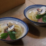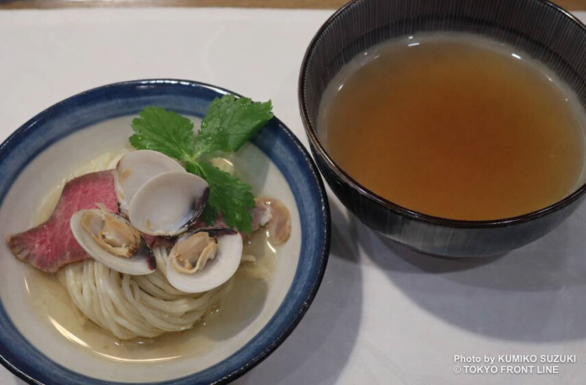 〆の冷やし仕立てで提供される「人 − jin − つけ麺」は、お肉シェフ×ラーメンシェフの初のコラボレーションの一品。昆布出汁に特製麺、高森和牛とハマグリを重ねた一杯。昆布の旨味が麺に絡み、驚くほどの一体感。熱々のつけ汁は、シジミや牡蠣オイルの旨味が重なり、飲み干したくなる美味しさでした。