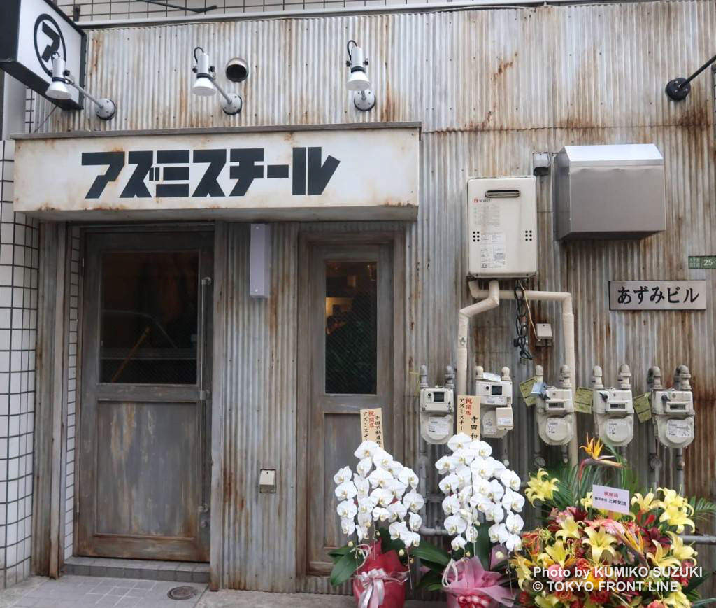 三軒茶屋の茶沢通りからほど近い「あずみビル」の1階に位置し、店名はこのビル名と、店内に随所で取り入れた“鉄(スチール)”の素材感に由来しています。