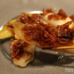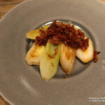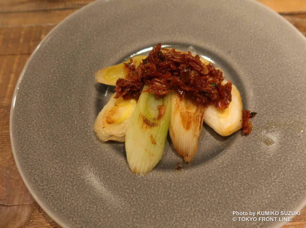 「江戸千住葱-海老辣油-」(770円)は、伝統野菜の千住葱を鉄板で焼き上げ、自家製海老辣油で仕上げています。