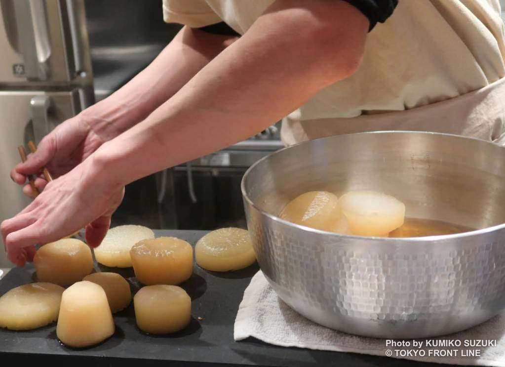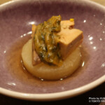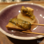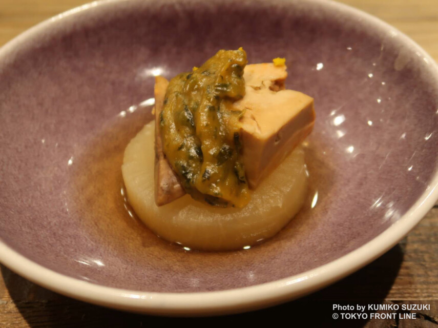 「あん肝大根」(1,100円)は、拘りの春菊味噌とクリーミーなあん肝、出汁の効いた大根が相性抜群でお酒が進む逸品。