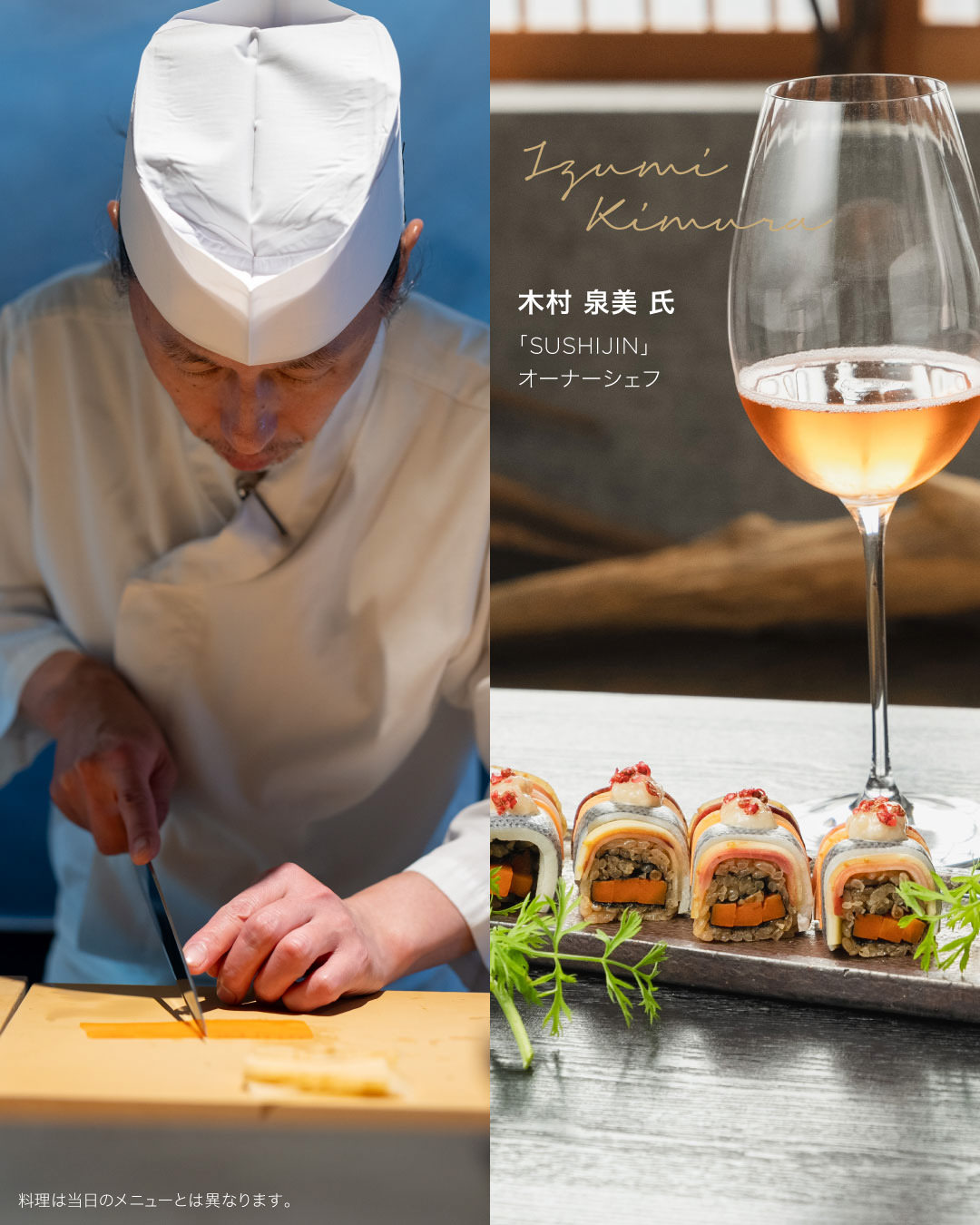 本ディナーでは、それぞれ異なるジャンルで名を馳せる2人のトップシェフによる特別なコラボレーションを実現します。クリュッグ アンバサダーを務める、世界最高峰のトリュフを提供する東京・西麻布のモダンフレンチレストラン「Margotto e Baciare」の加山賢太氏と、金沢・大工町にひっそりと佇む隠れ家のような空間で極上の寿司を提供する「大工町 鮨人」の木村泉美氏が、今回の単一食材に選ばれた「にんじん」のここでしか味わえないクリュッグとの至高のペアリングを体現した特別なひと皿を提供します。