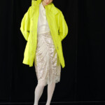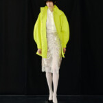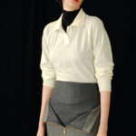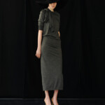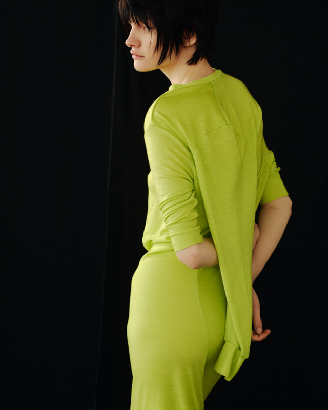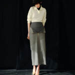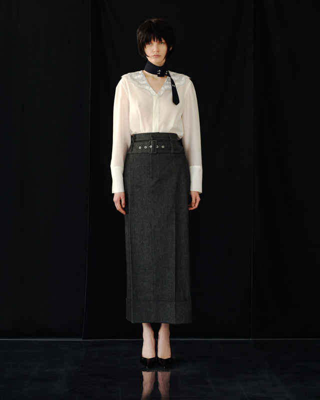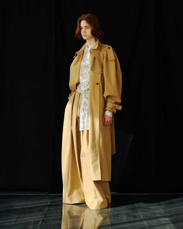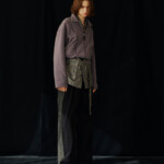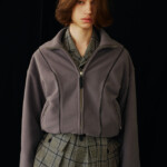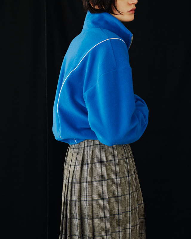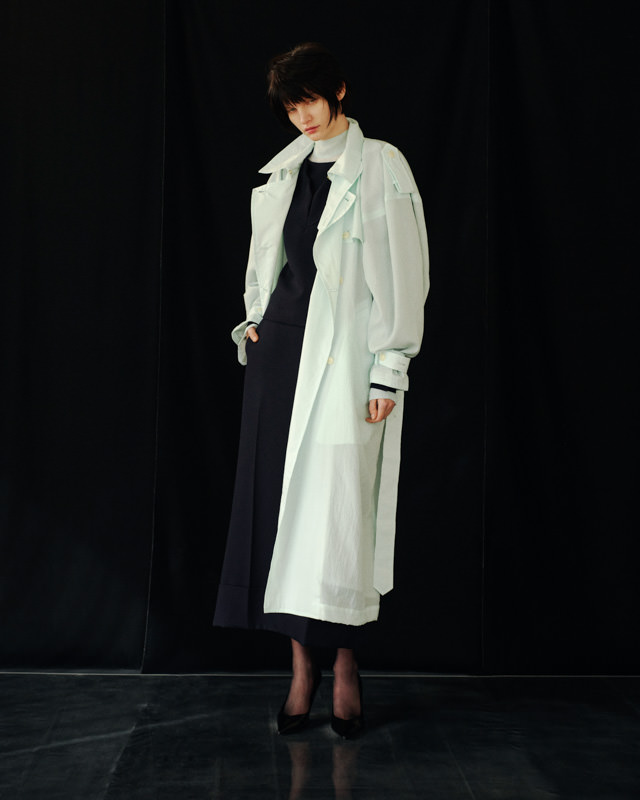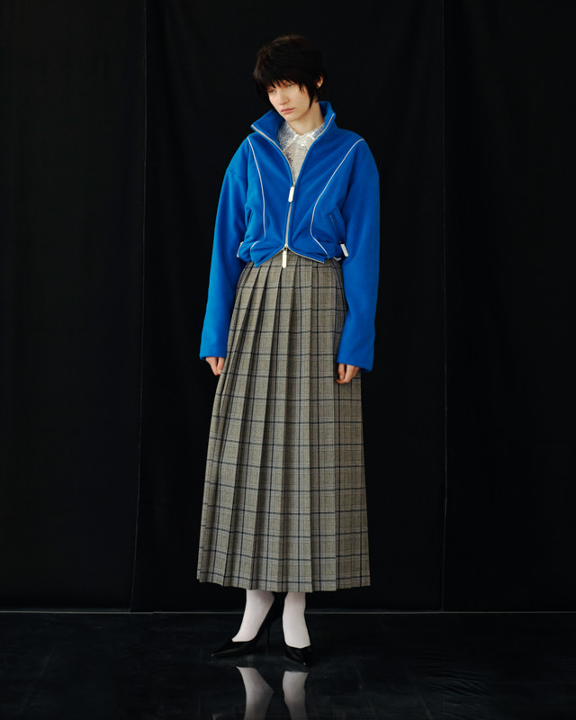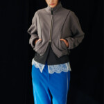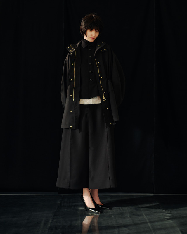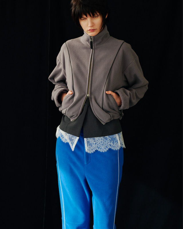 こうした日々のリアリティーから青木氏が感じとった現代へ眼差しは、今季、ユニフォームの中でもとりわけミリタリーモチーフの提案として表現されています。AKIKOAOKIにとってのミリタリーとは、Armyとしての物理的な力や歴史的な背景だけではなく、混沌としながらもスムーズな現代に対して「摩擦的な存在」としての役割を果たしています。要素を極限にまで削ぎ落としたカラーの無いセーラートップスや、表からは見えることのない位置にひっそりとレースが施されたジャンバードレス、サファリジャケットや丸いドレーブ袖のトレンチコートなど、ユニフォームを記号として散りばめながら、ブランド特有のパターンテクニックで着るものの身体を空間的に捉えた造形となっています。また、2026年春夏から引き続く”カジュアル”への解釈は、フリース素材のトラックパンツやコンパクトなジャージ、裏引のメッセンジャーコートなど、ユニフォームによってもたされる制約や緊張とは真逆にある状態を意味しています。