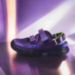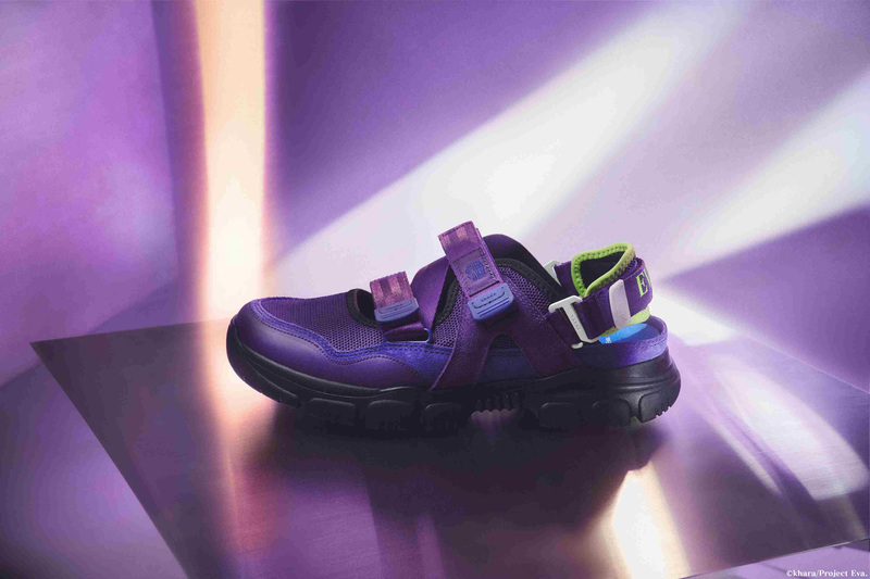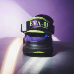 シリーズを象徴する初号機のカラーリングを洗練された配色でデザイン。ベースには赤紫色を採用し、初号機特有の青紫色をスウェードや各パーツに落とし込むことで、複雑な機体構造を表現。アイコニックな黄緑色はラバーソールと踵ネオプレンに配色され、足元にアクセントをプラス。インソールとプリントロゴには碇シンジのプラグスーツカラーを起用。