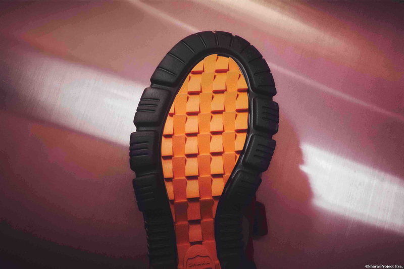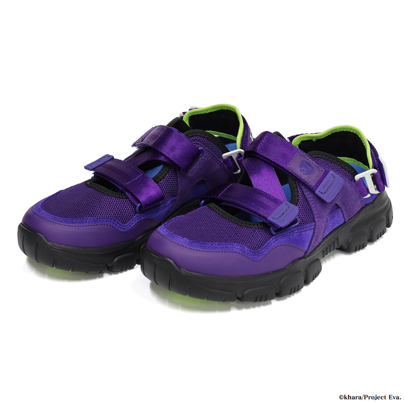 今作では、このOTTER TRAIL AT SECONDWAYに『エヴァンゲリオン』の世界観を落とし込み、EVA-00(零号機)、EVA-01(初号機)、EVA-02(弐号機)の3モデルを展開。各機体の象徴的なカラーリングを、単なる再現にとどまらず、ファッション視点で再構築することで、タウンユースに適した洗練されたデザインへと仕上げています。さらに、機体名をプリントしたスペシャルな踵ストラップでアレンジ。テープエンドパーツと金具フックには蓄光素材を採用し、暗闇でほのかに光るギミックが『エヴァンゲリオン』の世界観を表現しています。
