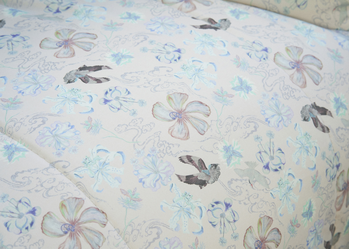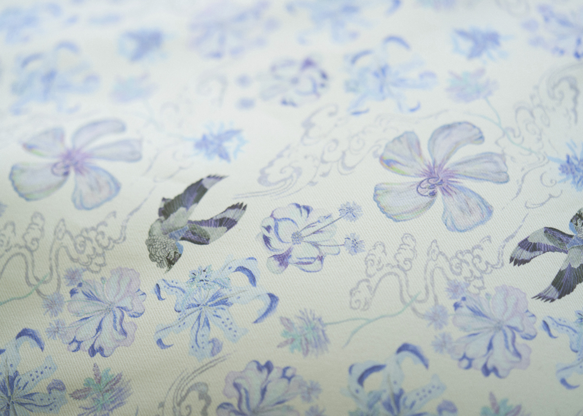 水の都と呼ばれる広島には太田川が、ブリオードにはローヌ川が流れ、両都市はいずれも豊かな川の流れを通じて海へとつながっています。その大自然の中で渡り鳥が舞い、日本を象徴する「ツバキ」、原爆に耐え抜いた強く美しい「キョウチクトウ」の花々、フランスの国花である「矢車菊」が生き生きと靡いている様子が生地に描かれています。