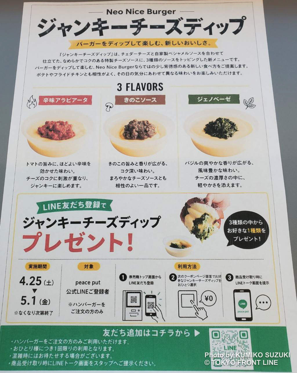 また、4月25日(土)から5月1日(金)までは、peace putのLINE公式アカウント登録者を対象に、『ジャンキーチーズディップ』を体験できる店頭キャンペーンも実施します。気になる方は、この機会に足を運んでみてはいかがでしょうか。