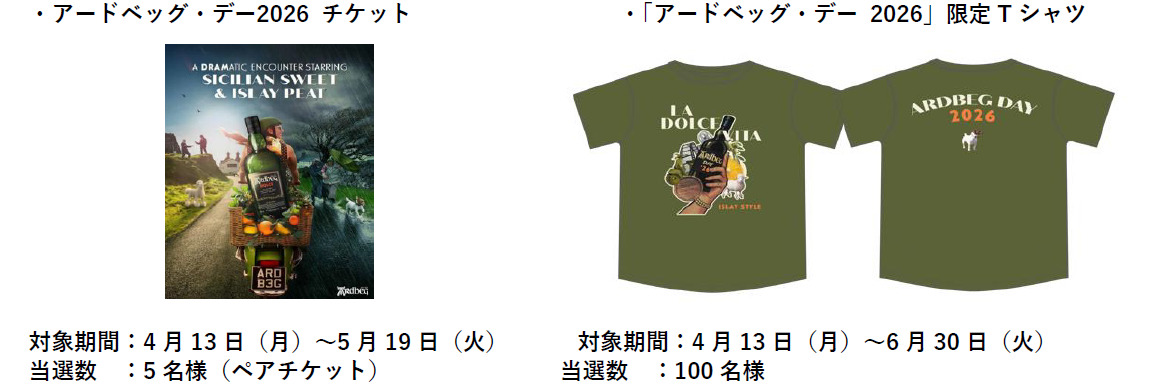 また、『アードベッグ・デー 2026』の開催を記念し、特別なキャンペーンを実施いたします。2026年4月13日(月)~6月30日(火)までの期間中、キャンペーン対象の「アードベッグ 10年」または「アードベッグ ウィー・ビースティー 5年」をご購入いただいた方限定で、毎年大好評の「アードベッグ・デー」限定Tシャツが抽選で100名様に当たるスペシャルキャンペーンにご応募いただけます。